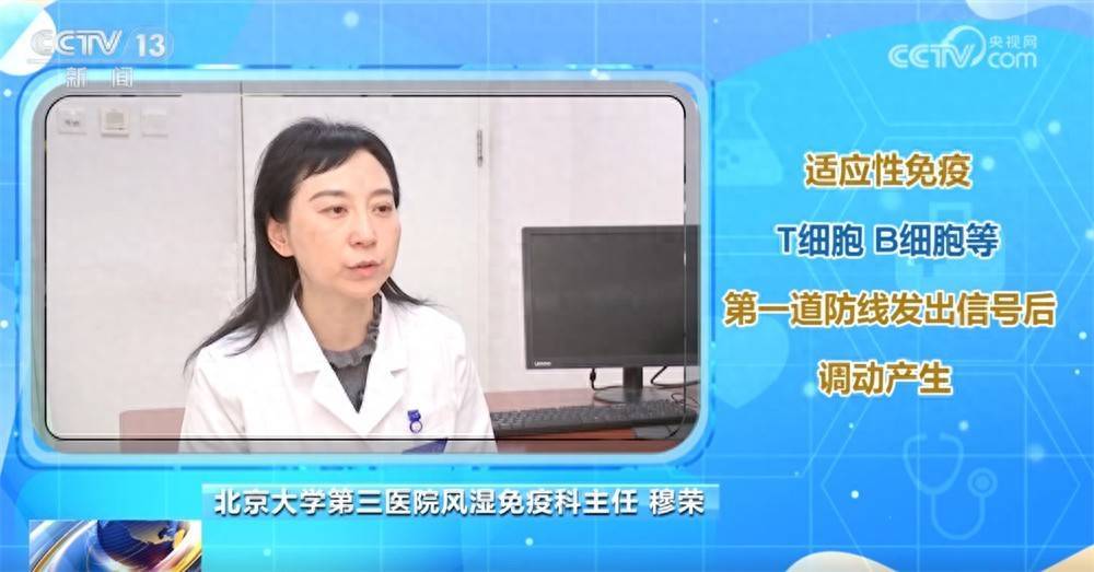 北京大学第三医院风湿免疫科主任穆荣称:“你全身的每一个细胞都是参与免疫的,它有天然免疫和适应性免疫,比如说我们的皮肤的屏障、身体的巨噬细胞等等,这些都是天然免疫,不需要身体调控。适应性免疫是第二道防线,像T细胞、B细胞等等,往往是在我们第一道防线发出一些信号之后调动它,然后产生适应性免疫。”