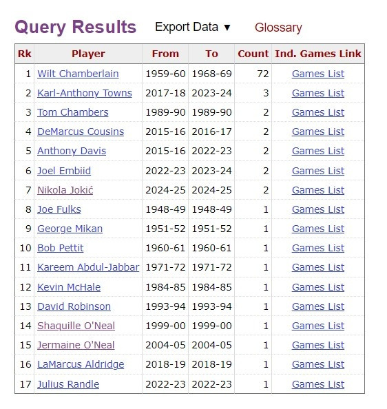 这是约基奇职业生涯第3次55+,他的55+场次已经追平唐斯,并列内线历史第2,第1的张伯伦72次。